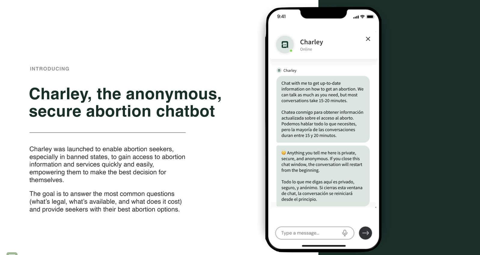 Charley is a user-friendly, judgment-free, and confidential tool designed by abortion experts for abortion seekers. Charley chats like a friend and answers like an expert, walking users through their options at their own pace while keeping user privacy and safety top of mind—no tracking or sharing of personal information.